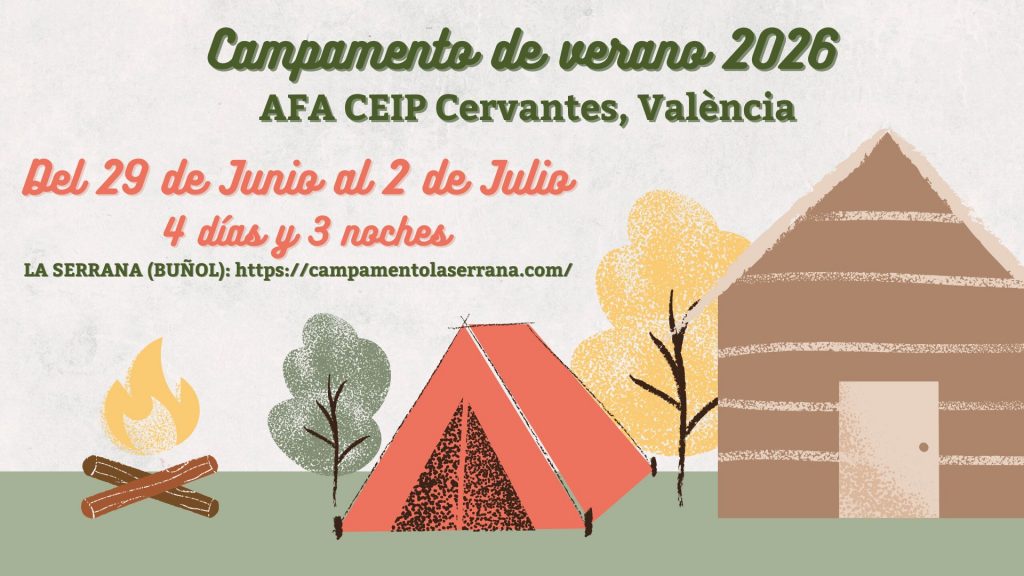 ¡Atención, familias! Ya está todo preparado per el Campamento de verano de la AFA CEIP Cervantes! Este año, nos vamos de aventura a la Serrana (Buñol), a solo 45 km de València. ¡Un lugar genial para disfrutar de la naturaleza! https://campamentolaserrana.com/#