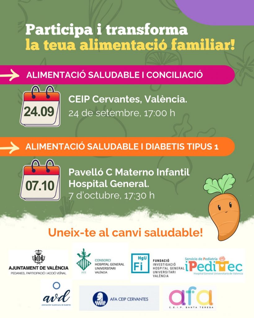 AFA CEIP Cervantes en col.laboració amb AFA CEIP Santa Teresa organitzen una jornada sobre alimentació saludable i diabetis tipus 1 per al proper dia 7 d´octubre de 17:30 a 19:00h.